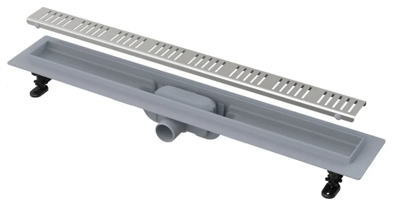 Водоотводящий желоб Alcaplast APZ10 Simple с решеткой из нержавеющей стали, горизонтальный выпуск - низкая высота монтажа 6,2 см - регулируемые ножки устойчивость к химическим повреждениям - возможность надежного соединения желоба и гидроизоляции - длина: 550 мм - скорость стока воды 30 л/мин - комбинированный гидрозатвор (запатентованное решение) - легкоразборный, с возможностью прочистки желоба вплоть до сточной трубы (ø40 мм) Материал: Прочный пластик, морозоустойчивый, а также устойчивый к химическим и механическим повреждениям. Сифон: Полностью разборный, в следствие чего может быть легко очищен.Состоит из двух отсеков и работает по принципу комбинированного гидрозатвора. Сухой клапан предотвращает попадание запаха из канализации в помещение при высыхании воды в сифоне.